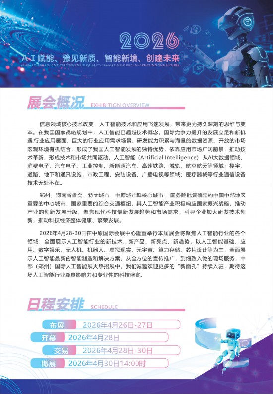 2026中原(鄭州)國(guó)際人工智能產(chǎn)業(yè)博覽會(huì),定于2026年4月28-30日在中原國(guó)際會(huì)展中心隆重舉行,規(guī)劃展覽面積30,000平方米,預(yù)計(jì)參展企業(yè)500家,專業(yè)觀眾預(yù)計(jì)達(dá)28,000人次,展會(huì)規(guī)模與影響力將創(chuàng)歷屆新高。展會(huì)將廣泛吸引來(lái)自中國(guó)內(nèi)地、香港、澳門特別行政區(qū)及臺(tái)灣省等多個(gè)地區(qū)的展團(tuán)、機(jī)構(gòu)與企業(yè)參展,國(guó)際化參展比例預(yù)計(jì)超過(guò)18%,力爭(zhēng)實(shí)現(xiàn)多方共贏、成效滿意的展會(huì)目標(biāo)。