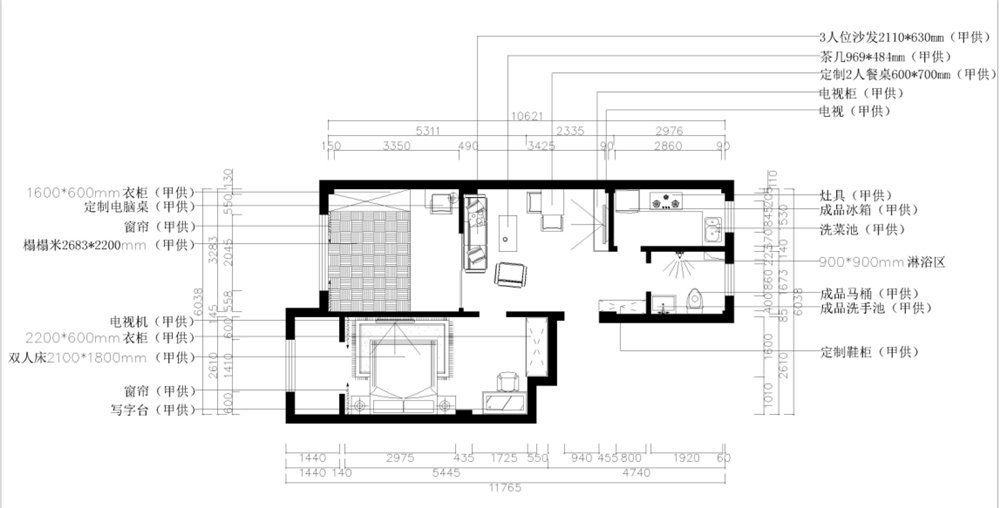戶型布局規(guī)整,功能分區(qū)大體合理,整體采光較好,空間的功能性很強,根據(jù)房間的合理布局以及面積,定義為現(xiàn)代風(fēng)格。 本戶型是1口人住,業(yè)主是26歲白領(lǐng)、男、準備做婚房。對家裝的要求是要現(xiàn)代風(fēng)格的,要一室改成兩室的,整體要求簡潔明亮。對裝修的預(yù)算在12萬左右,想做大包。 從戶型上看來各個空間都安排的很規(guī)整,入戶門開始,首先是玄關(guān),采用平頂下300mm吊頂,而餐廳和客廳放在一個空間里,既節(jié)省了空間不浪費,又顯得寬敞明亮;客餐廳相對,通鋪800*800mm地磚;整個客餐廳都是現(xiàn)代風(fēng)格家具,潔凈大方,能顯得空間更加簡潔、明亮,整體風(fēng)格更為突出;主臥采用800*800地磚,顯得簡潔干凈,而家具也是采用現(xiàn)代風(fēng)格的家具,更能突顯現(xiàn)代風(fēng)格的特點,墻面采用白色乳膠漆,回字型吊頂,使整體休息環(huán)境更為舒適;次臥室做了榻榻米和定制電腦桌,加上現(xiàn)代家居,非常漂亮;次臥室門用的是透光玻璃推拉門,使客廳增加采光、更加明亮;廚房采用集成吊頂,800*800mm防滑磚正鋪。衛(wèi)生間采用集成吊頂,地面采用300*300mm防滑磚正鋪。整體戶型居住方便,布局合理。 整體設(shè)計給人一種寬敞、明亮、成熟穩(wěn)重的感受。