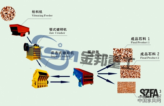 石料生產(chǎn)線主要由振動(dòng)給料機(jī)、顎式破碎機(jī)、反擊式破碎機(jī)、圓錐破,振動(dòng)篩、集中電控等組成,配以除塵器等設(shè)備。碎石生產(chǎn)線設(shè)計(jì)產(chǎn)量一般為50-500噸/小時(shí)。并可根據(jù)客戶的不同工藝要求,配置各種型號(hào)的設(shè)備。特別適合于石灰石、灰?guī)r、頁(yè)巖、花崗巖等中等硬度以下巖石的破碎生產(chǎn),適用于水電、建材、高速公路、城市建設(shè)等行業(yè)。石料生產(chǎn)線的設(shè)備配置主要依據(jù)客戶對(duì)石料規(guī)格以及產(chǎn)量和石料的用途來(lái)確定,我們提供售前、售中、售后的全面服務(wù),依據(jù)客戶生產(chǎn)現(xiàn)場(chǎng)來(lái)配置流程,力求為客戶做到最合理、最經(jīng)濟(jì)的碎石生產(chǎn)線。