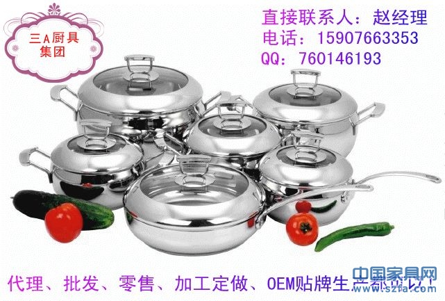 高檔不銹鋼廚具、湯鍋、炒鍋、煎鍋、奶鍋、蒸鍋、刀叉、碗筷碟子等眾多款式,批發(fā)、零售、代理還可以加工定做,OEM貼牌生產(chǎn)!廠家直銷!??!櫥柜、炊具等產(chǎn)品配套的最佳選擇!消費(fèi)者最愛的禮品,贈(zèng)品!